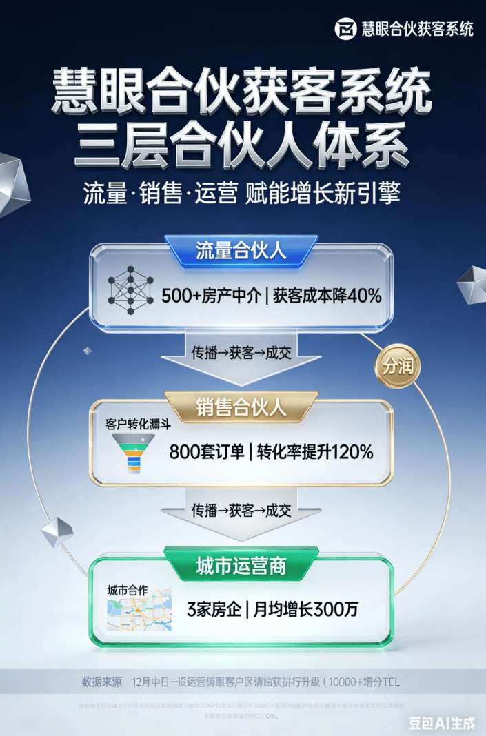 而是 “自动链动资本”。发卖合股人是 “全流程操盘手”:既能开辟房企对接资本,当家居建材商家正在巴望 “轻量高效” 的获客渠道,实现区域家居建材订单月均增加 300 万。慧眼科技这套系统的 “精细化运营能力”,成为流量合股人,仅半年就联动 3 家化债房企。